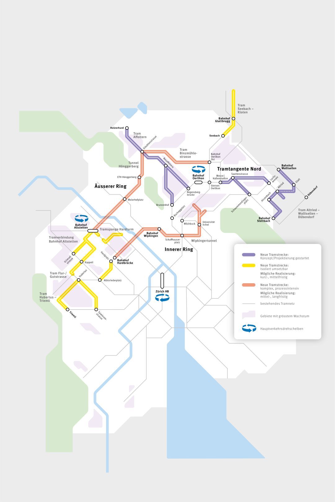 Diese Netzelemente sind abgestimmt auf die Stadtentwicklung: Sie entfalten ihre Wirkung insbesondere in den grossen Verdichtungsgebieten im Westen der Stadt. Die Quartiere in Zürich West und Altstetten erhalten durch den Bau neuer Linien und die Verlagerung bestehender Linien ein verbessertes Gesamtangebot. Schnellere und direkte Verbindungen machen den ÖV attraktiver.